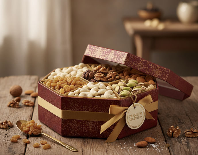 Make every celebration memorable with the Hexagon Dry Fruit Box — a timeless gift that beautifully combines taste, tradition, and corporate elegance.